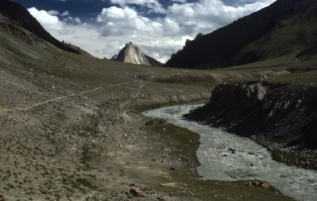 Day 4 - 22 Aug 1999 Looking back up the valley towards Shingo La. You can still see that huge rocky mountain in the centre of the photo. |