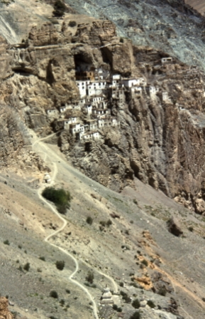 Day 7 - 25 Aug 1999 Today we did a day trip up to the spectacular monastery complex of Phugtul which is seemingly out of a fantasy world, perched as it is in such a rugged position up a narrow gorge. This photo is of Phugtul as we approached it along this pathway. |