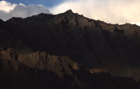 Day 8 - 26 Aug 1999 At the end of the long day's walking from Purni to Muni we make camp just before Muni and watch the evening shadows creep up this mountainside. |