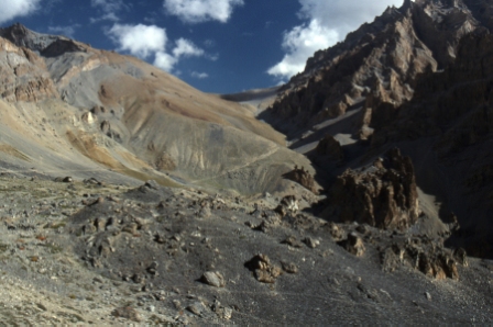 Day 2 - 20 Aug 1999 The approach to Shingo La, involves a long trek up this valley strewn with Morraine. Shingo La is at an altitude of about 5100m. |