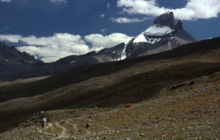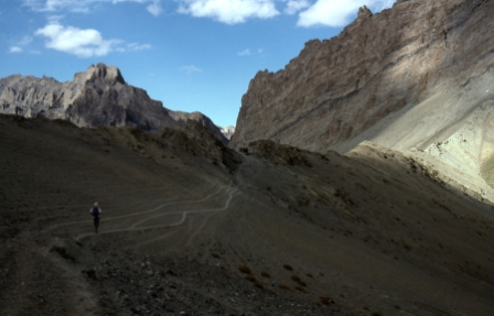 Day 17 - 4 Sep 1999 Shoga approaches Sirsir La (4805m) which can be seen straight ahead. |