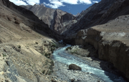 Day 1 - 19 Aug 1999 On the first day of our trek from Darcha we followed this valley upstream towards Shingo La. The route crossed this deep cataract on a narrow wooden bridge. Our mules were not happy about crossing this bridge! Later this day in this very valley our camp was attacked by people from a village near this bridge. See the Kashmir page for details. |