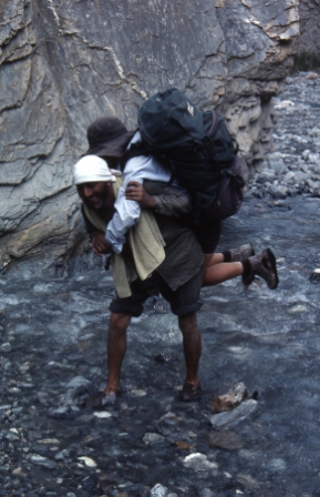 Day 21 - 8 Sep 1999 The first day of trekking out of Lamayuru took us through another steep sided gorge, like the one we had come through on our way to Lamayuru three days earlier. Here Afzul is carrying Kendy across this stream (the rest of us just waded across of course!) |