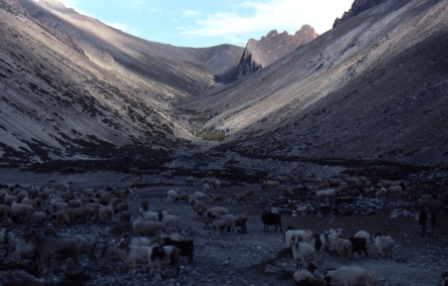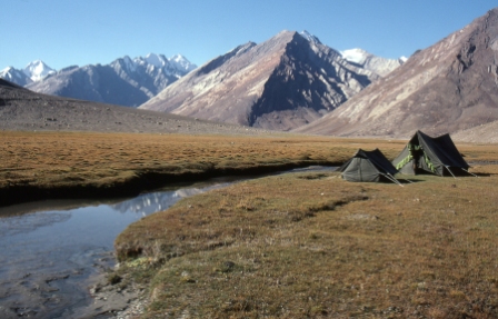 Day 23 - 10 Sep 1999 After a long day of walking across Yogma La we passed through the village of Kanji and then onwards until finally, late in the day, we arrived here at this plain where we camped. We shared this location with many goats and their shepherds. During the night the shepherds impounded our horses and demanded money for their release. Afzul and Shoga did all the negotiating but it was an uneasy night. |