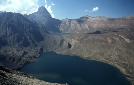 Day 4 - 22 Sep 1999 Another side trip to this vantage point from which excellent views of the Kashmir lakes were had. We spent the next 4 nights camped at the farthest lake in this photo. |