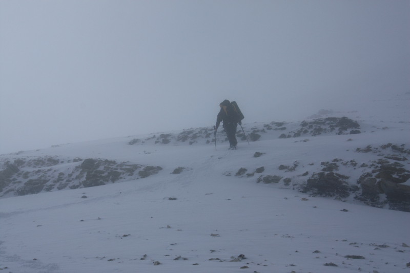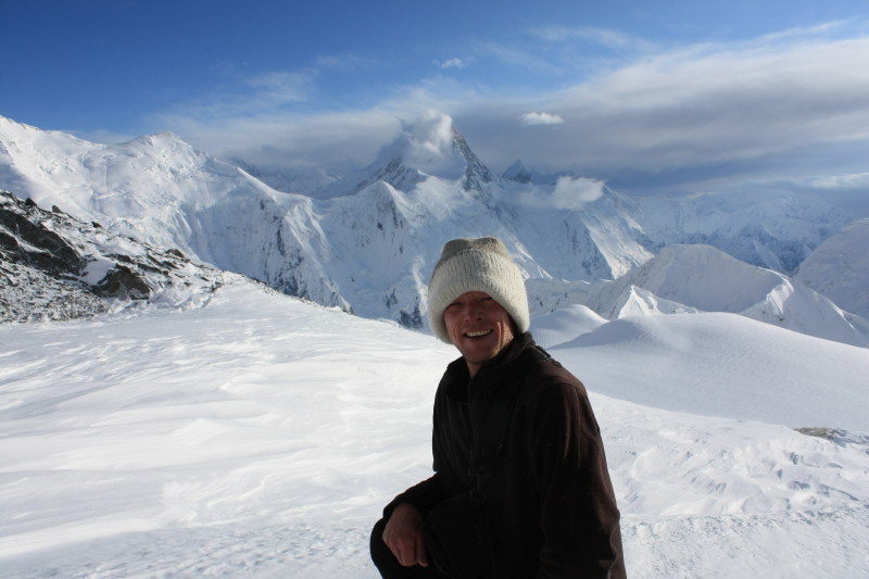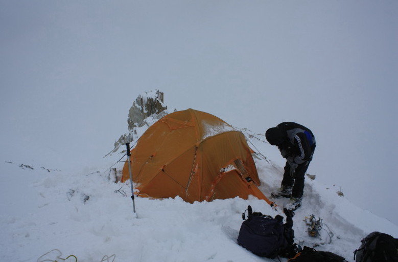 Finally the wind had dropped. A lot of snow had fallen overnight. Everything was frozen. We packed up slowly. For the 3rd time we climbed to the crevice below the rock rib only this time we were carrying everything with us. Our 70m rope was setup as a fixed rope up part of the steep section so it could now be climbed with the aid of a jumar. This was better, and finally we and all our gear completed the ascent of the steep rocky section. But I am very weak and very breathless. We reached an exposed spot at 5680m and setup camp. The wind picked up again and it started snowing again. It is cold with snow building up everywhere and getting into the tent. Wind and snow is raging all about as I write my diary tonight.