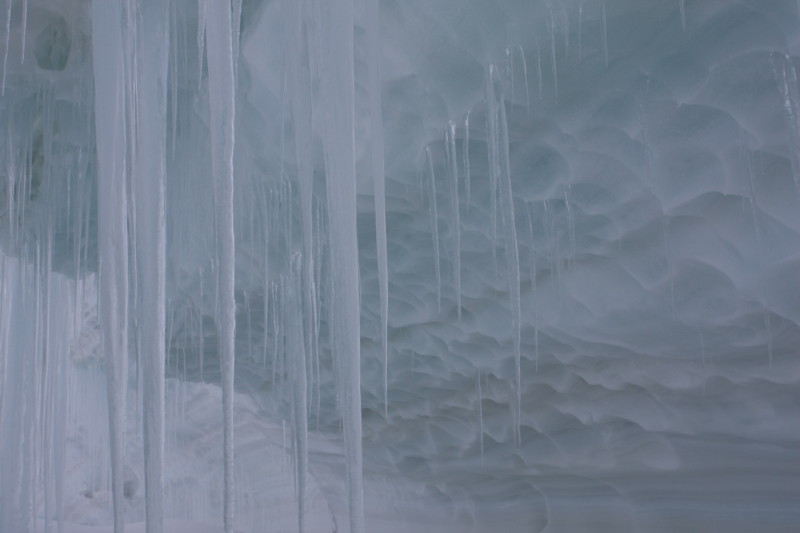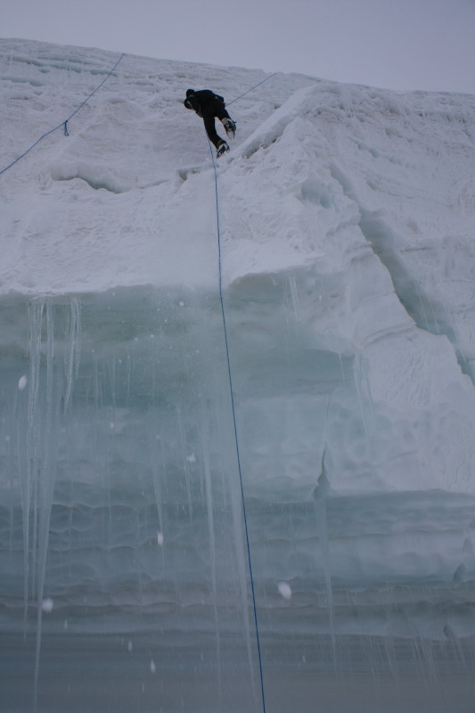 Another extraordinary and very hard day. All you can do just to survive. We left the high altitude Marble Wall camp at 9am. We now had to descend into a different valley via a glacier. We jumped a crevasse to reach level ground. After meandering down an ice shelf we reached the top of an overhung cliff of ice on the glacier. Edik and Danat talked among themselves and then retreated back up the slope. I realised they wanted to attempt an alternative route involving a heavily corniced ridge. They abandoned this idea eventually and we returned to the overhung ice cliff that we had reached before. We abseiled down this, smashing huge icicles that were hanging down from the roof of the overhung ice cavern. We continued down the glacier until the way was blocked by an icefall. This was followed by a lot of faffing around and uncertainty, backtracking, and no good decision making. The weather deteriorated. We were supposed to reach Khan Tengri Base Camp tonight and our supplies of food and gas were almost completely gone. With no way down the glacier we were forced to camp here at 5270m. I am now feeling like we are in a potentially serious situation with no obvious solution except the prospect of another long hard day ahead.