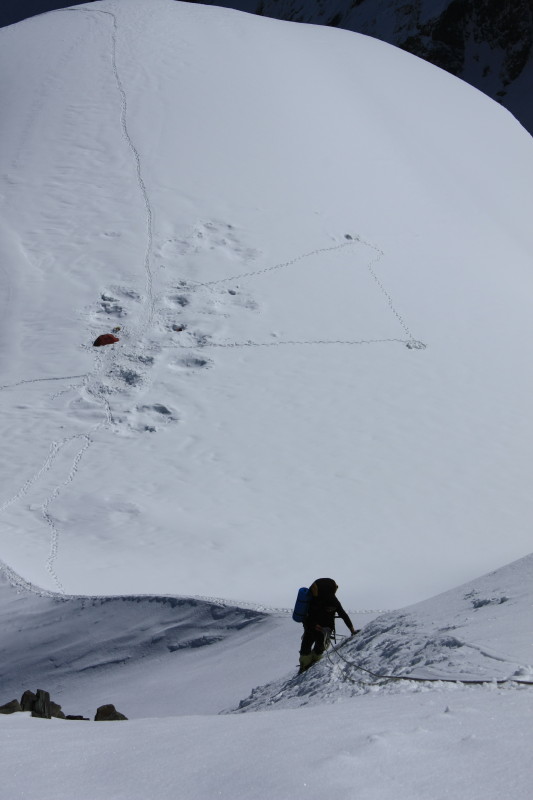 Today was another amazing day. We woke to a beautiful morning and stunning scenery. We set off from Camp 2 at around 8am. It was slow and laborious climbing up the fixed ropes. The entire day was spent climbing alone and I didn't speak to anyone. I wasn't feeling too well. A spectacular knife-edge crest was crossed. Then a steep rock step had to be scaled. Long and exasperatingly hard climbing led to Chapaev Peak (6100m) which I reached in whiteout - alone. Now unroped I followed faint tracks in the snow to the saddle between Chapaev Peak and Khan Tengri. This was Camp 3 (5860m), and the tent there was already well dug in. Another cramped night. It is snowing outside.
