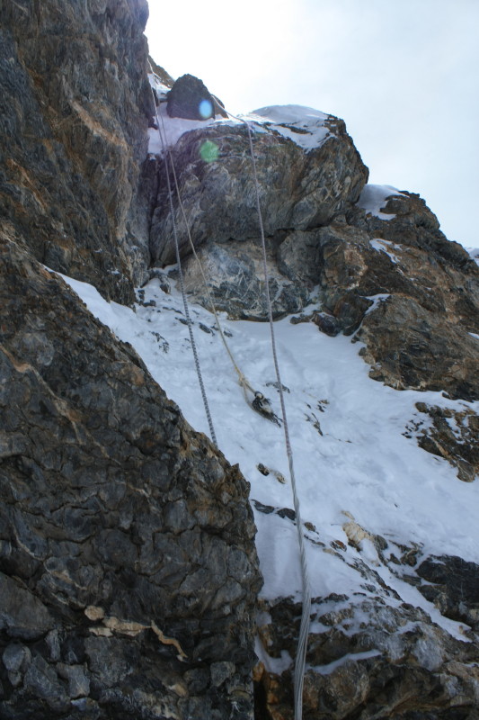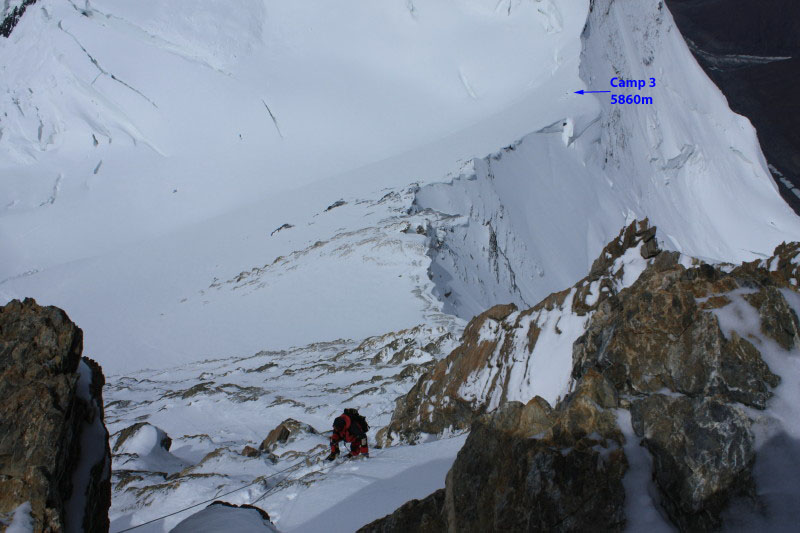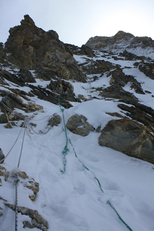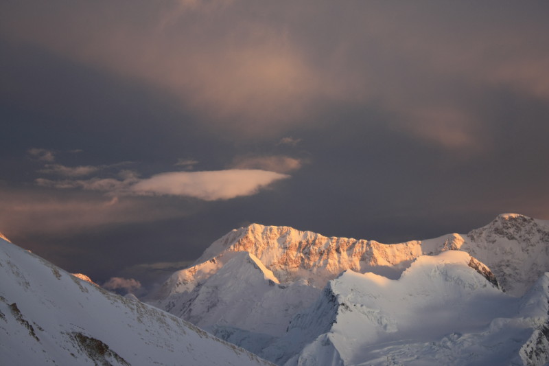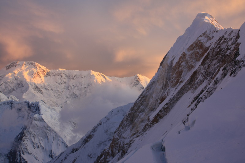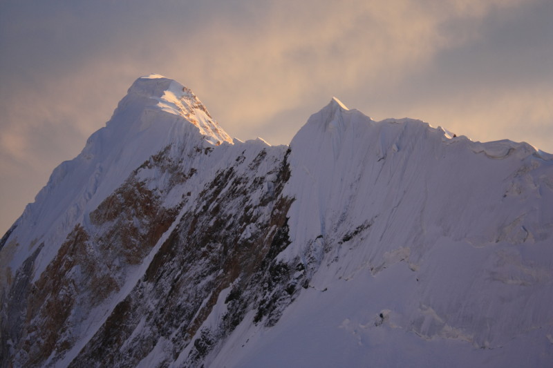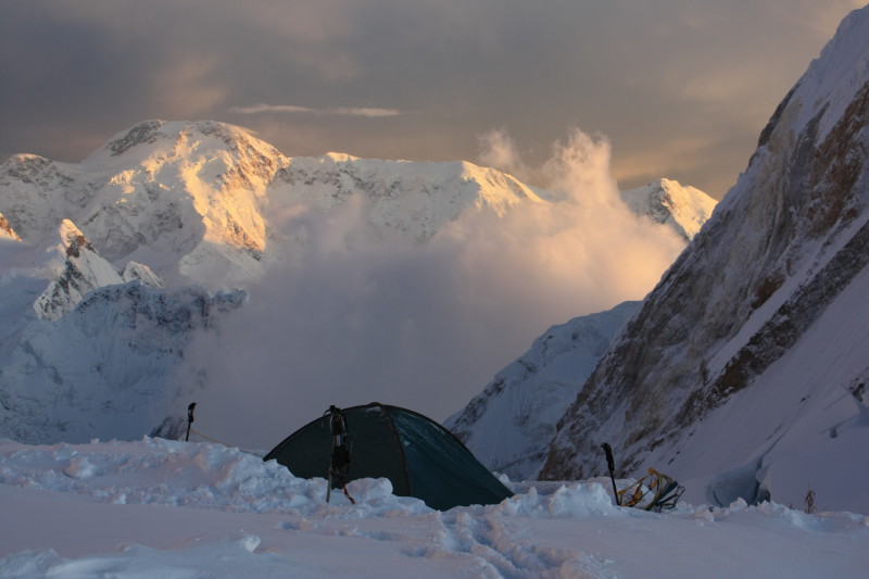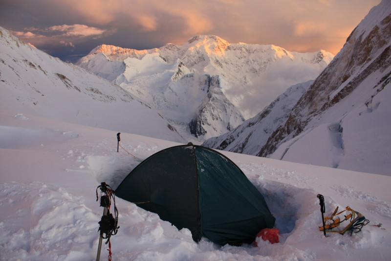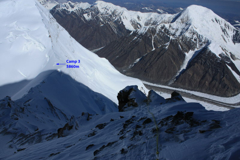 A miserable night with no sleep was spent sandwiched between these two stinking guys. Alarm went at 4am. This would be summit day. It was very hard to get going but the scenery was beautiful. The fixed ropes were very ragged and old, many of them just strands of core missing their sheath for whole lengths. My energy began to wane and it became steep and I was slow. I reached a rock overhang that I could not get up. I decided to turn back at this point, my altitude was about 6400m. Returned to Camp 3 (5860m). Beautiful evening views of Pobeda Peak.
