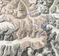 detailed relief map showing the route of my alpine traverse across Marble Wall and up Khan Tengri. |