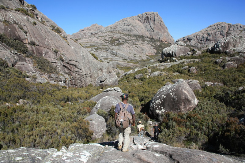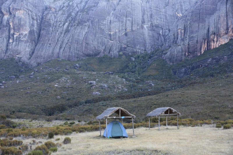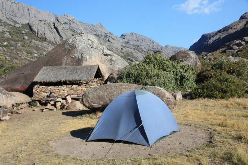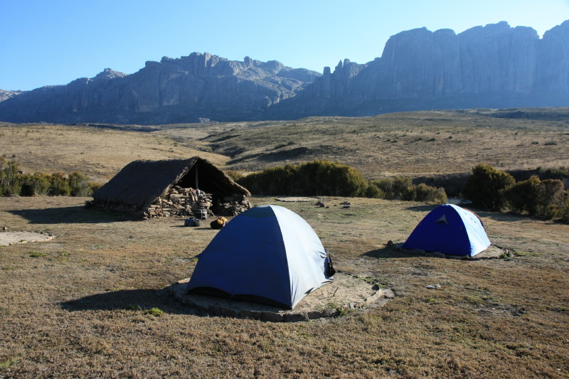 | 17 Sep 2014 | Taking a different path we crossed the main mountain range at a point to the north of Pic Boby. From there the first really great views of the Tsaranoro Massif were seen. Easy walking on a well made path. Saw several lizards and a very colourful grasshopper. Descended the western side of this range to a camp at about 1600m. This was located by a different stream which was still safe to drink from. | Camp on western side of range at 1600m. |