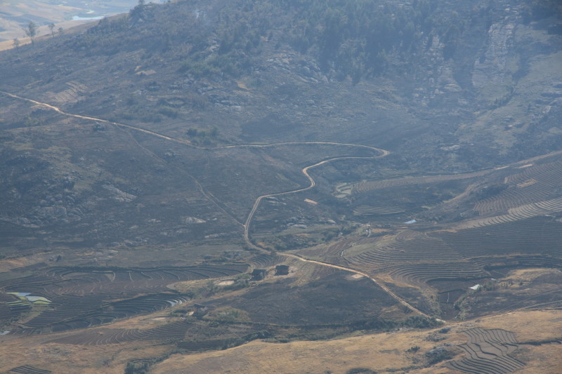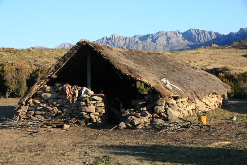 | 18 Sep 2014 | Most groups doing this trek continue west, descending to a road head to exit from. But my bike was back in the Namoly park entrance and so we crossed the range again, on the same path we used yesterday. My guide and porter had run out of food and wanted to get back to their village. I watched the sun hit the Tsaranoro Massif and took some photos. We returned to the Namoly valley, taking a path down a different way to the one we had come up on the 15th. We reached a village near the gîte where my bike was stored and there was a small market going there. I bought a few fresh veges. I had most of the afternoon back at the gîte and was able to rest before my long journey by mountain bike back to Antananarivo. | Gîte near Namoly valley park entrance, 1427m. |