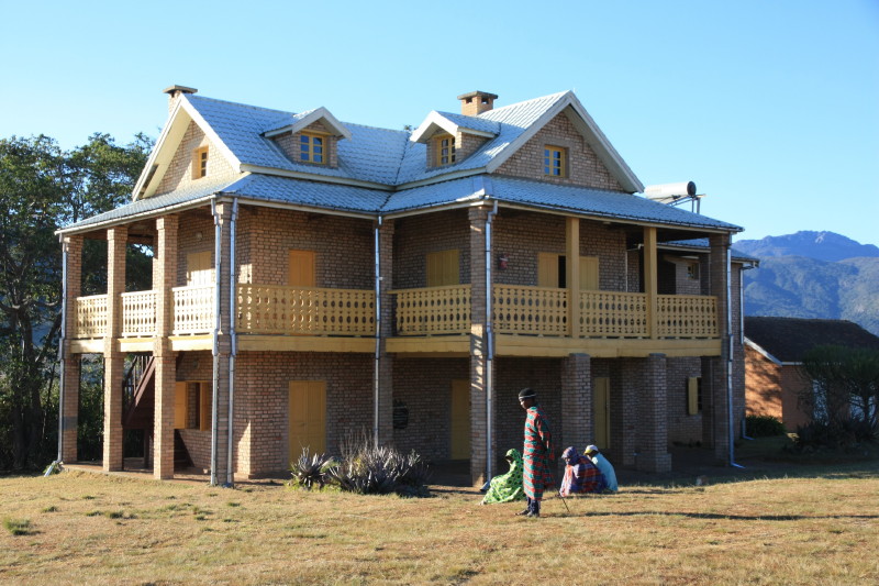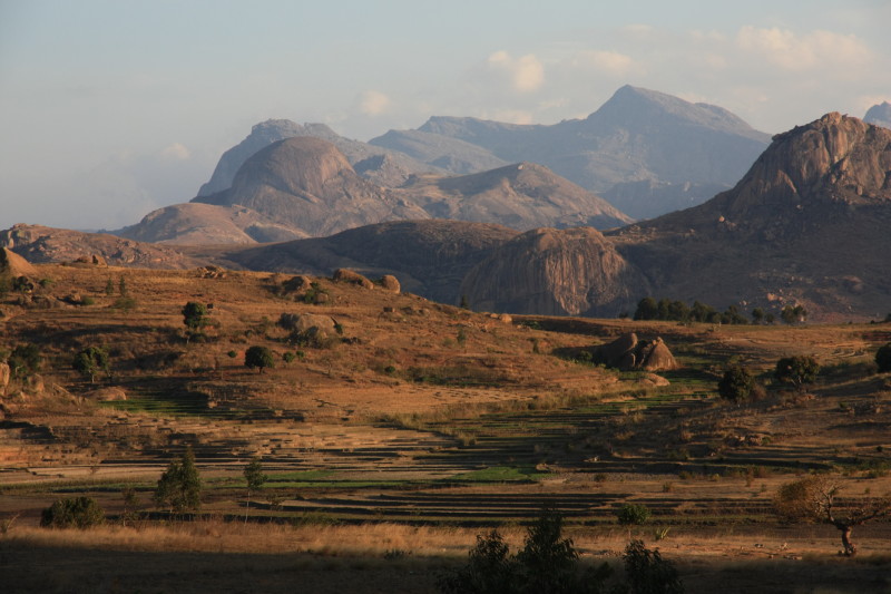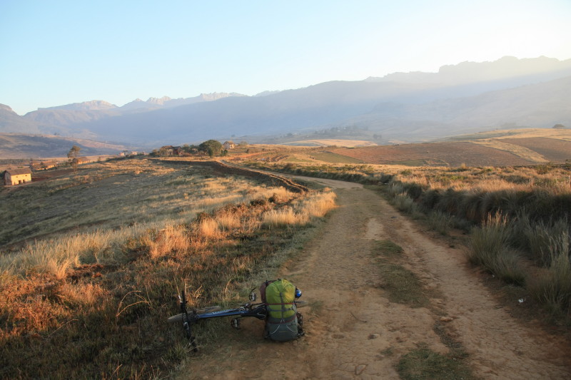 | 14 Sep 2014 | 104km | 1140m | 1427m | Fianarantsoa to Andringitra NP | One of the best, hardest and most adventurous days of mountain biking ever. The first half of the day was spent cycling down the RN7 to Ambavalao, about 56km. This was hilly riding including a pass at 1270m and long descent into Ambavalao (altitude 1000m), a ramshackle town where I arrived around 11:30am. Then it was off on rough dusty tracks south from Ambavalao the remaining 48km to Andringitra. The rough tracks were hilly and windy, crossed rivers on rickety wooden bridges and passed through some tiny villages. There was almost no traffic, just village people on foot or on old bikes. Climbed and climbed, approaching the granite range of Andringitra. Arrrived at the park entrance and organised a guide for hiking the next few days. Cycled 3km further on to the gîte where I stayed the night. Cooked my own food on the open fire in the kitchen used by the owners of the gîte. | Andringitra Gîte. |