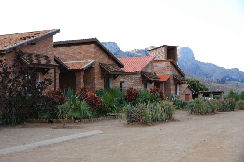 | 19 Sep 2014 | 60km | 1427m | 980m | Andringitra NP to Anja Reserve | Today I rode back to Ambavalao along the rough trails that I had come in on on 14 Sep. Much faster and easier in this direction as it was mostly downhill and by now I was carrying hardly any food. Got to Ambavalao around midday. This town is straight out of a John Wayne western. Bought a little food and cycled 12km west along the RN7 to the Anja Reserve. There I found some nice accommodation and in the afternoon I went on a guided hike in the reserve and saw many ring tailed lemurs and chameleons. | Bungalow in Anja Reserve. |