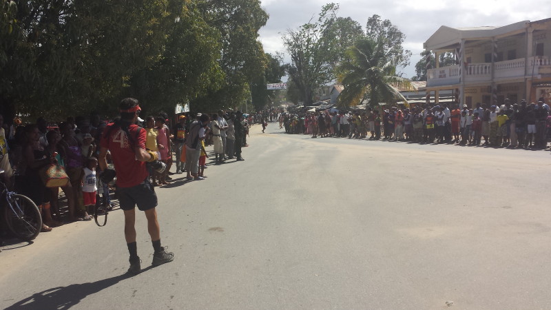 Another very positive aspect of the race was the amazing diversity of landscape passed on the course. Although I often felt that the endless red dusty tracks would never end, the landscapes were amazing. There were empty white beaches with waves from a crystal clear Indian ocean crashing on the shores, there was a jagged limestone coastline, there was open savannah landscape and coconut palms. There was an amazing forest of huge baobab trees. There was a red canyon full of amazing rock formations called Tsingy, similar in shape to limestone karst but red in colour and very fragile. There was a blue crater lake. There were rivers to ford and rice paddies to cross. There was a town too. All the while we ran on little tracks or rarely driven roads. Finally the race ended in the town of Ambilobe and throngs of local people lined the streets to welcome the runners to the finish line.