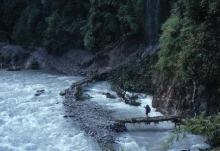 Day 1 - 9 Oct 2004. The track climbs through the warm, humid and dense forest of the lower Langtang valley. Here the track actually goes into the river itself to avoid obstacles on the bank. |