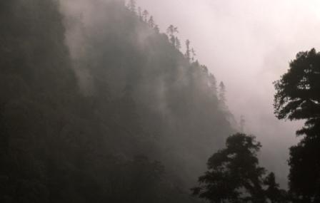 Day 1 - 9 Oct 2004. From our camp site at Lama Hotel (2340m) we see through forest mist to the steep sided walls of the valley that we are climbing through. |