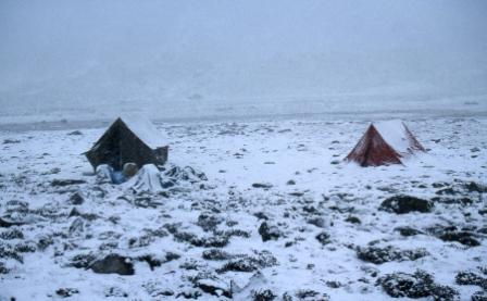 Day 5 - 13 Oct 2004. We got back down to our tents by about 2:30pm, the snow still lay around. Contrast this sunny scene with the snowy conditions of this time yesterday! See here! When we got back here I had a bad altitude headache and spent most of the remainder of the day resting in the tent trying to diffuse the headache with multiple cups of tea. |