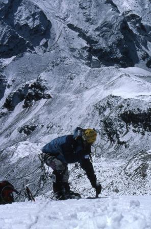 Day 5 - 13 Oct 2004. Ang Pemba hammers in a snow stake to belay me down the steep ice slope that you need to descend to get down from Yala Peak. |