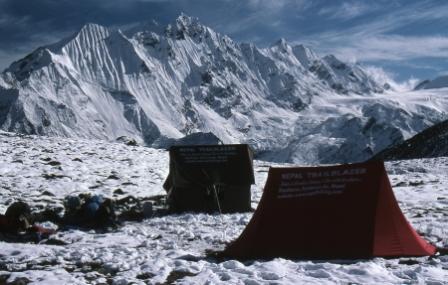 Day 4 - 12 Oct 2004. Here are our tents at Yala Peak base camp (4950m). Heavy snow fell during the afternoon and into the night. Tomorrow we would be making our bid for the summit of Yala Peak, starting at around 4am. With the snow falling heavily I began to wonder if our summit bid would be possible ... Also, being only the 4th full day of trekking I did not feel adequately acclimatised to the altitude. |