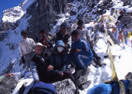 Day 10 - 18 Oct 2004. Ganji La (5130m). Here we all are on the top of Gangi La. Front row, left to right: Ashley, Kendy, Suresh Rear Row: Our four porters. |