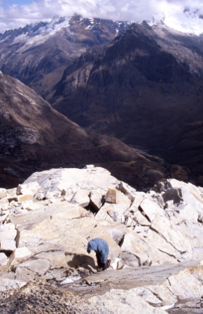 Another day of grey skies. From our camp site at Taullipampa in the Santa Cruz valley we did a side trip to the summit of Sentillo, an offshoot of the peak of Millisraju at altitude about 5000m. The climb started on grassy slopes and became an interesting rock scramble higher up. After this side trip we headed to Alpamayo South base camp to camp.