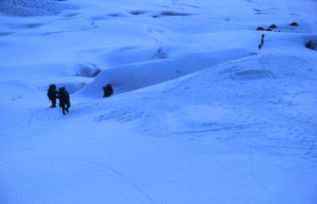 Starting out from Camp 1 at about 6:30am, the first part of the climb we were able to do without being roped up. The tents at Camp 1 can be seen on the top right of the photo. It was very cold at this time of the morning so we were pleased to get going. |