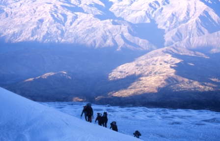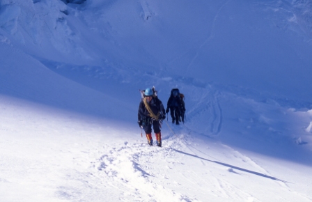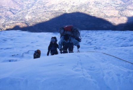 We remained roped up for some steep climbing. The shadow of Huascarán is seen in the background. | |