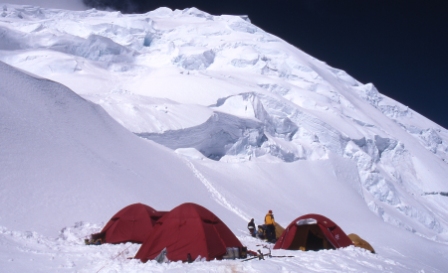 Today was the first day using ropes and the first day of technical snow and ice climbing. The route from Camp 1 to Camp 2 was steep in places, and wound its way up among teetering seracs and crevasses. The ice formations were spectacular, as was the scenery. We set off at about 6:30am and almost all of today's climbing was done while the route was still in shadow. This meant that the ice remained solid and good for climbing, as the sun did not reach it until about 11am. We reached Camp 2 by midday, and the afternoon was spent resting. I was feeling the affects of altitude at Camp 2 and found it impossible to sleep. We did, however, enjoy the spectacular scenery from the camp. We ate only sparingly from our meagre supplies.