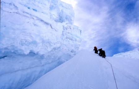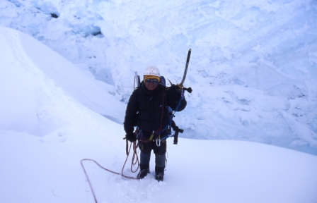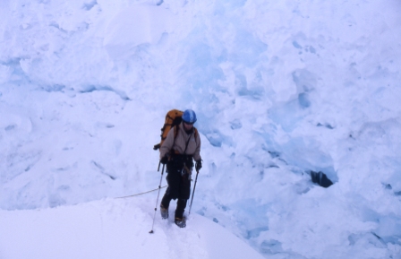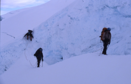 Today we retraced our steps of two days ago to Camp 1 and thence all the way down to base camp. The descent to Camp 1 was particularly spectacular, with some more abseiling or steep downclimbing on the rope. Again, much of the descending was done while the slopes were still in shadow. It was another incredible and challenging day. At base camp there was some rain during the afternoon but we were back in the zone of ample food supplies, and we feasted in the base camp tent that night, the happy beneficiaries of Cesar's excellent cooking.