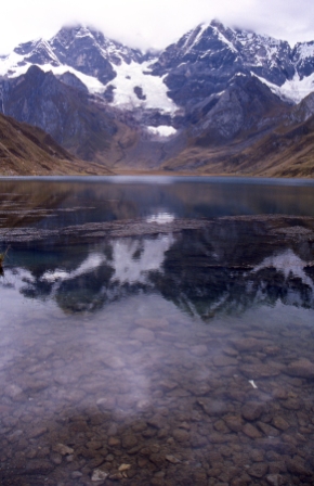 Early in the morning at Laguna Mitococha, fantastic views across the lake towards the glaciated peaks of Mituraju and Jirishanca. |