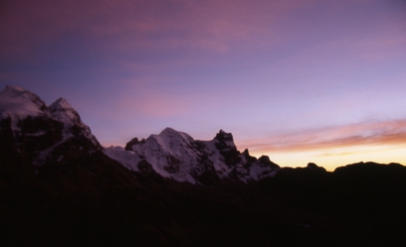 The light on nearby peaks just before dawn. Here we are at an altitude of about 5000m. | |