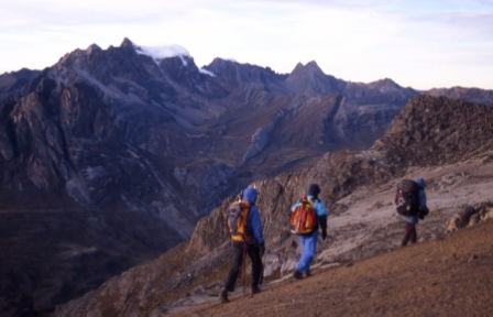 Today was a huge day and one of the highlights of the trek. We rose at 3:15am and after a 4am breakfast we set off for our Pumarini summit bid. It was still dark, and we climbed up through uneven tussocky grass until the stars faded and light grew in the east. When the sun rose we were on loose scree on the side of Pumarini at about 5000m. A cold wind blew as we reached the snow cap. Here we donned harnesses, roped up, and began climbing the snow and ice to the summit of Pumarini.
