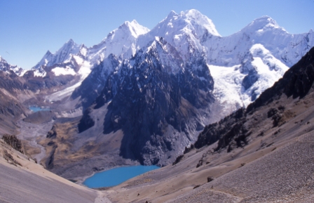 Here is our first views of the turquoise Laguna Jurau, seen from the top of the pass through Cerro Antonia. Siula Grande is the highest peak, clearly seen on this perfect day. Our route follows the track through the scree that can be seen in this photo. |