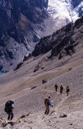 Today we climbed up the side of the valley to a pass through the Cerro Antonio. The altitude of this pass was about 5000m and it led into the Sarapococha valley. This valley is famous for the mountaineering misadventures of a British mountaineering expedition to Siula Grande that became the subject of the book and film "Touching the Void". We would spend 2 nights camped below Laguna Jurau, and this is the day of our arrival at that lake.