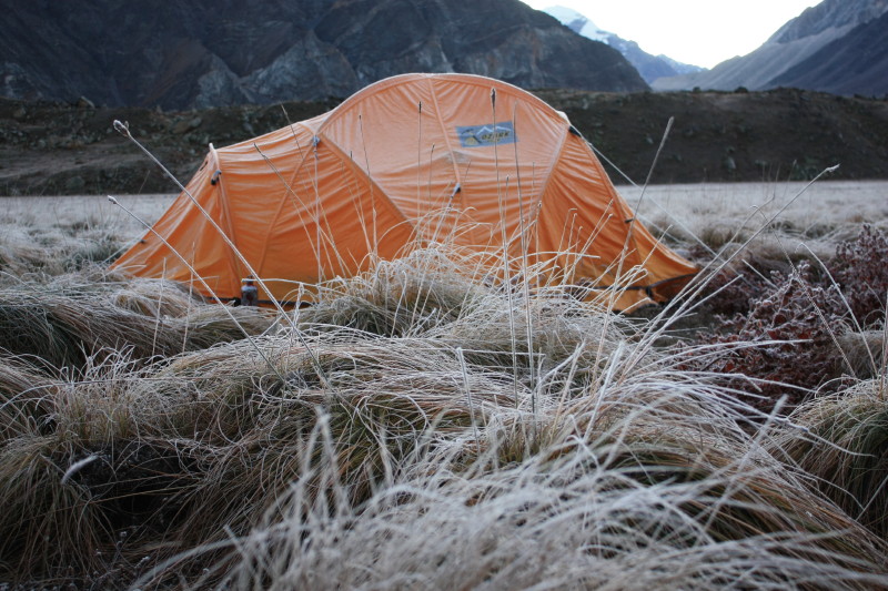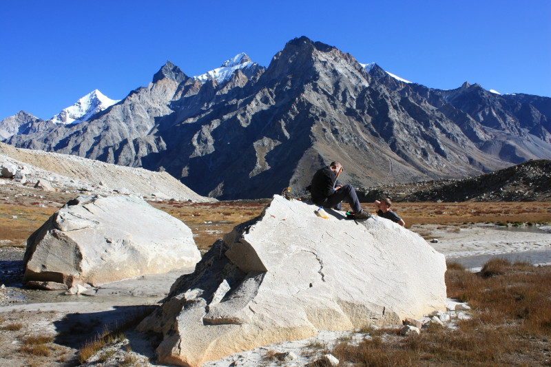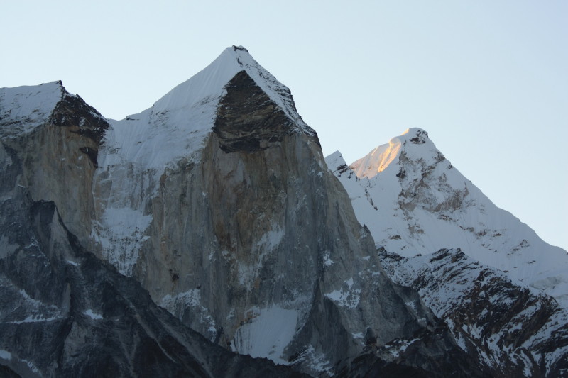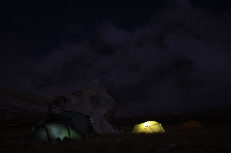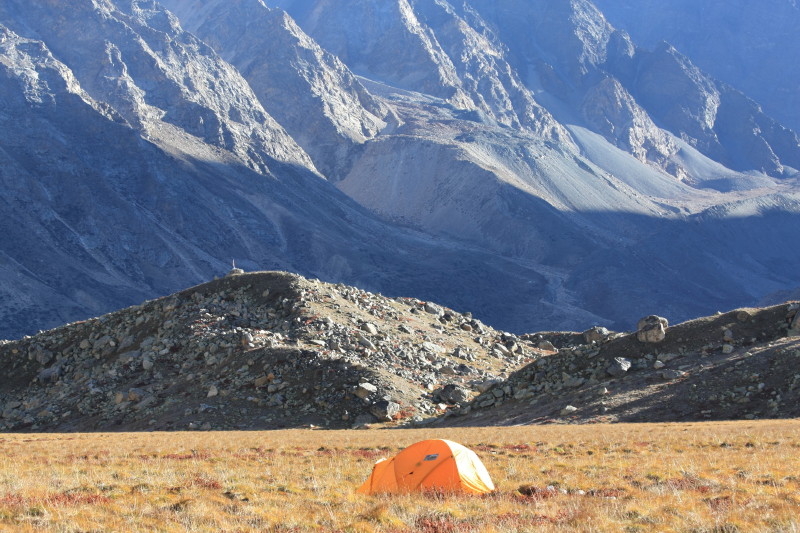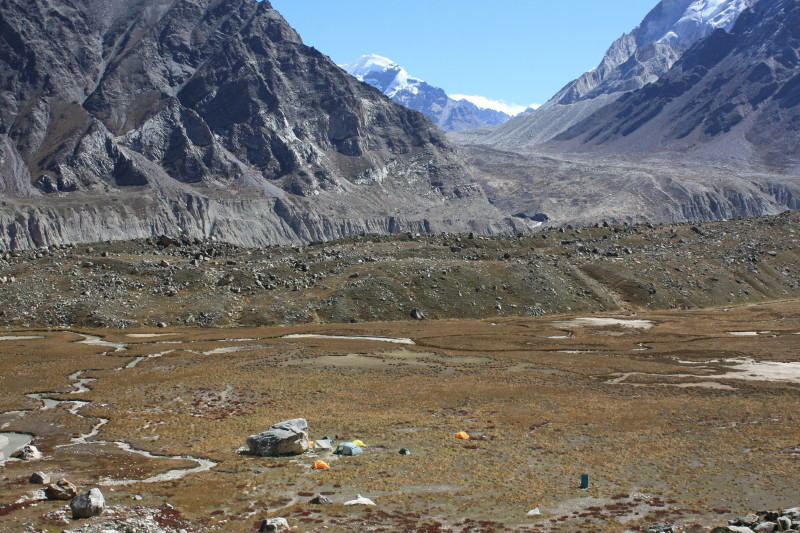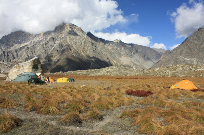 We arrived at the base camp on 23 September and this became our home until we left there on 8 October to return home. For much of the intervening time we were climbing on Shivling, and we established 2 more camps higher on the mountain. When climbing we were sometimes camped higher on the mountain for several days at a time. However we returned to base camp several times to rest, eat good food, regain our strength, prepare for the climbing, and retrieve more equipment to portage up the mountain.