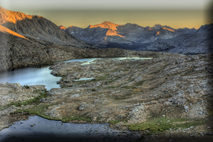 It is possible to hike through all these areas on established trails, and the John Muir Trail is a popular trail leading from Yosemite Valley to the summit of Mt Whitney. However it is my preference to trek away from popular trails, keeping above the treeline where possible, and exploring remoter and lesser visited areas high above the bear and mosquito infested valleys! Our route therefore took us over many high passes and our camp sites were usually near high lakes well above the timberline. We did three separate trips, each between 7 and 9 days long, thereby allowing us the opportunity to restock our food and supplies every week or so. In this we were greatly assisted by our friends Doug and Lizzy who live in Bishop, a small town conveniently located very close to the mountains on the eastern side of the Sierra range.
