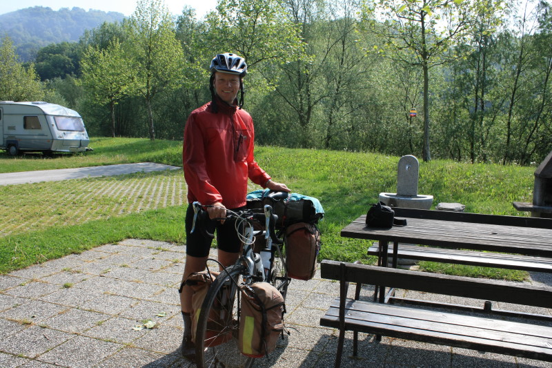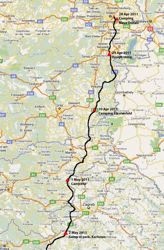 About 2 days of riding southwards from Vienna brought me to the border with Slovenia at Bad Radkersburg. I chose a route through lower Austria that had relatively little in the way of major hills or mountains, but nevertheless some pleasant forests and wineries. I had some cold wet weather, but enjoyed a great campsite at Fürstenfeld. Here's a map: