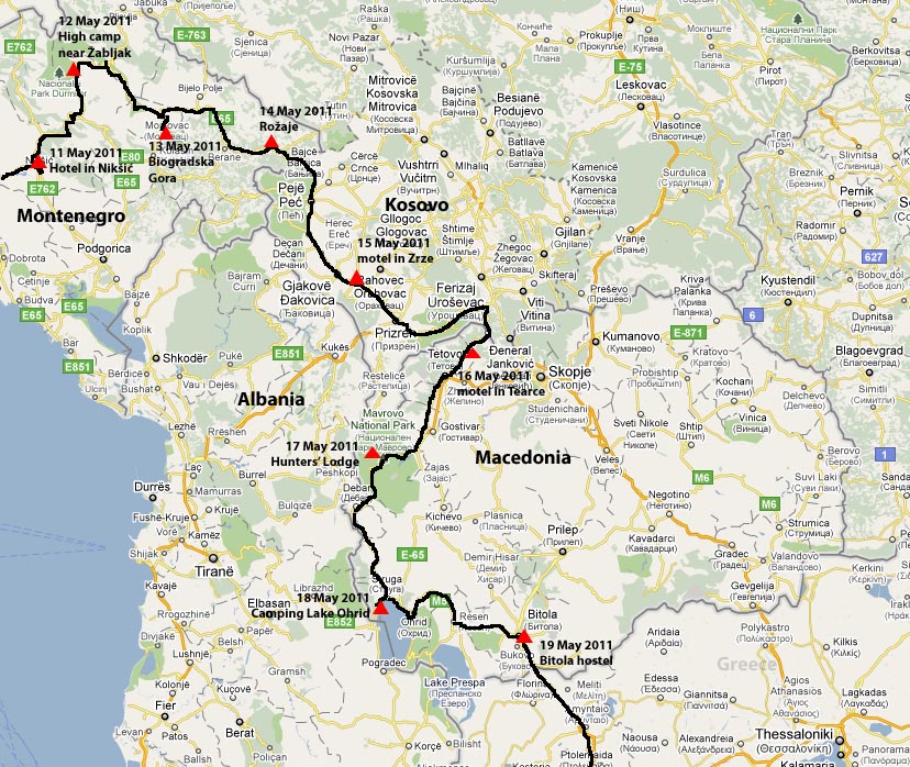 The weather worsened considerably during this afternoon and I reached the top of this pass in cold rain and low cloud. 16 May 2011. The journey continued beyond this pass, and late on 16 May I rode into Macedonia, where the story continues in Stage 7 - Macedonia. |