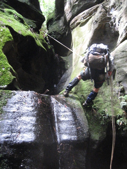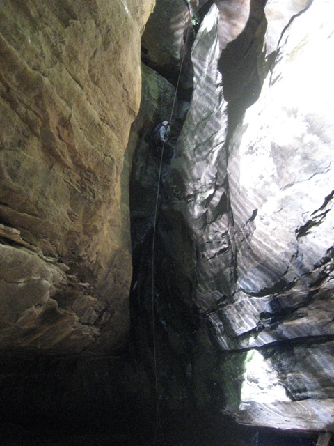 On Day 4 we did two classic canyons and entered a more familiar creek system. The first of these was so deep and dark that none of the photos from my small digital camera are worthy of showing. But the second canyon was less dark and below are the photos from this canyon. The canyon had about 4 abseils in total, and the final abseil was at least 25m in length. After doing these two canyons we headed down to a larger creek to camp.
